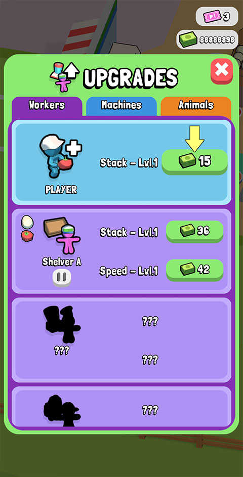 6、随着收入不断增多,逐步解锁更多货架与食物品类,致力于将超市发展壮大!