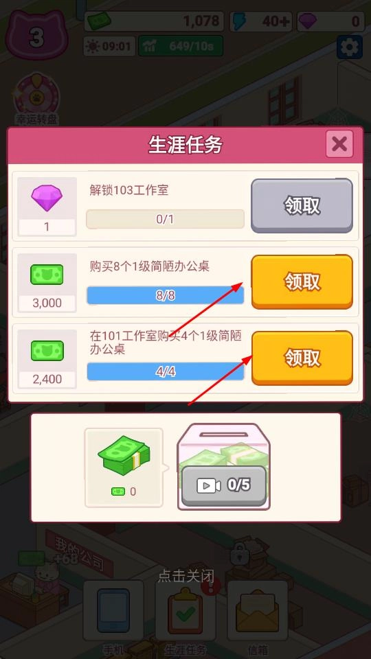 2. 当完成生涯任务之后,点击领取按钮,即可获取钻石、美元等奖励。