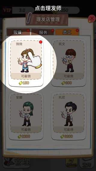 2、完成基础设施购置后,接下来需聘请一名理发师。同样点击“管理”按钮,于员工一栏里找出可雇佣的理发师。