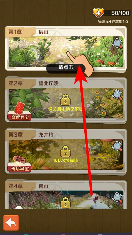 4、要进行备货的话,可以前往不同区域,像第一章提到的后山,只要点击该区域就能够进入,在里面获取所需的食材等物资,以此满足店铺经营的物料需求。