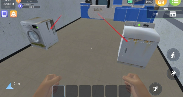 1、游戏开始时,玩家会拥有两台洗衣机,以此为起点经营属于自己的洗衣店。