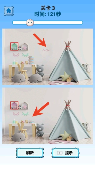 4、要是碰到不容易察觉的差异,可点击右下角的提示按钮寻求帮助,系统会将一个差异点高亮显示。每个关卡设有三次提示机会,助力你顺利通关。