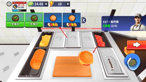 6、制作完成后,点击汉堡把食物递给顾客,收获他们的满意与奖励。