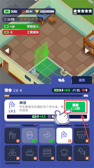 2、进行宿舍升级工作时,投入【120】资金来打造【淋浴】设施,以此满足学生睡前洗澡的需求,进而提升宿舍的舒适度。