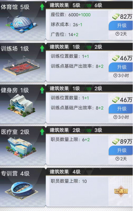 当前版本的优先升级顺序如下:专训营>体育馆>医疗室=健身房=训练场。专训营的等级决定了可雇佣专训员的数量,最高4级(球队达到21级时)可解锁10个专训员。升级体育馆能够增加广告位与座位数量,从而获取绿钞收益。