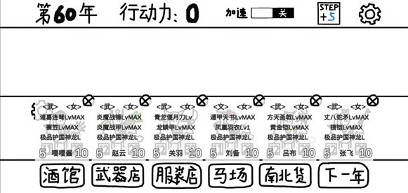 6、在前期,很难刷到优质的武器和服装,所以前期在武器、服装以及马匹的配备上随意一些就行,在第一年就进行配置。不过,务必在30年之前集齐6个神龙,这需要借助在马场刷出的神龙buff。