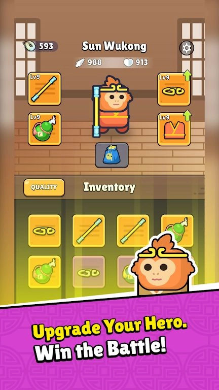 3. 升级——和其他经典塔防RPG游戏一样,在《美猴王英雄传说》里,你能够获取令人激动不已的英雄升级机会与装备,这会使你在对抗丧尸群时变得更为强大。