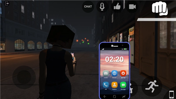 4、进入游戏后,可先点击【chat】进行对话。游戏界面中,左边的圆圈用于控制前进或后退,右边的操作则是蹲下与跳跃。