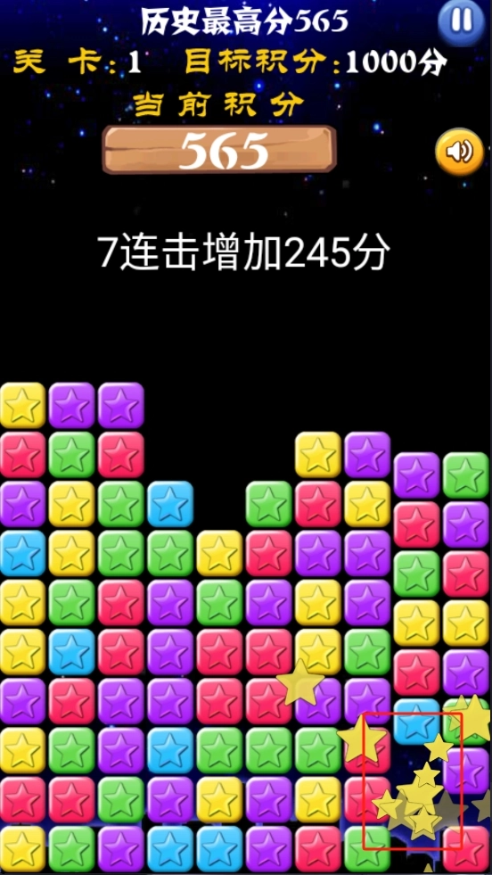 2、进行消除操作时要留意连击情况,例如7连击能够大幅增加分数。优先寻找密集的同色星星区域,就像红框里的黄色星星,通过连续消除来触发高连击。