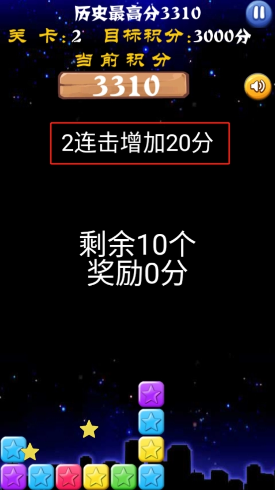 3、关卡2的目标是达到3000分,通过使用2连击的方式瞄准相邻的同色星星,不断进行消除来积累积分。同时,要留意剩余的奖励星星,争取将它们全部消除。