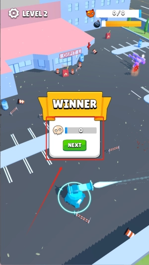 在第二个挑战环节,操控蓝色的飞行载具,借助水流类的攻击方式清除所有敌方单位。当所有对手都被击溃后,点击标有“NEXT”的按键,就能进入成果统计页面,获取该阶段的通关嘉奖。