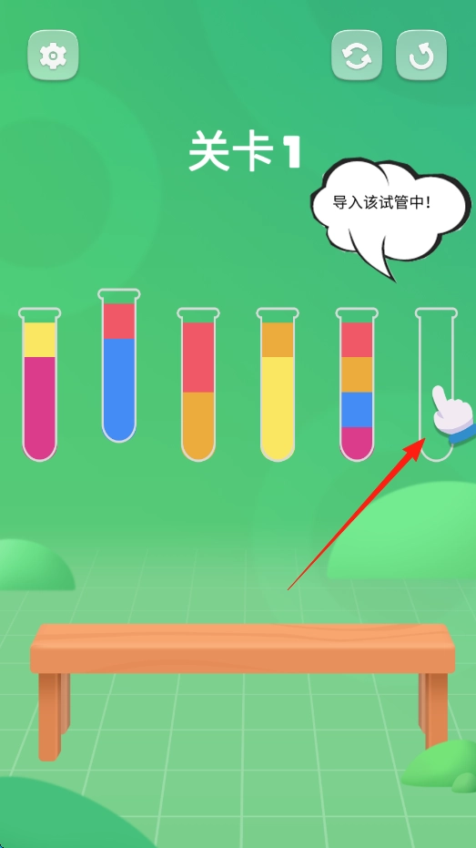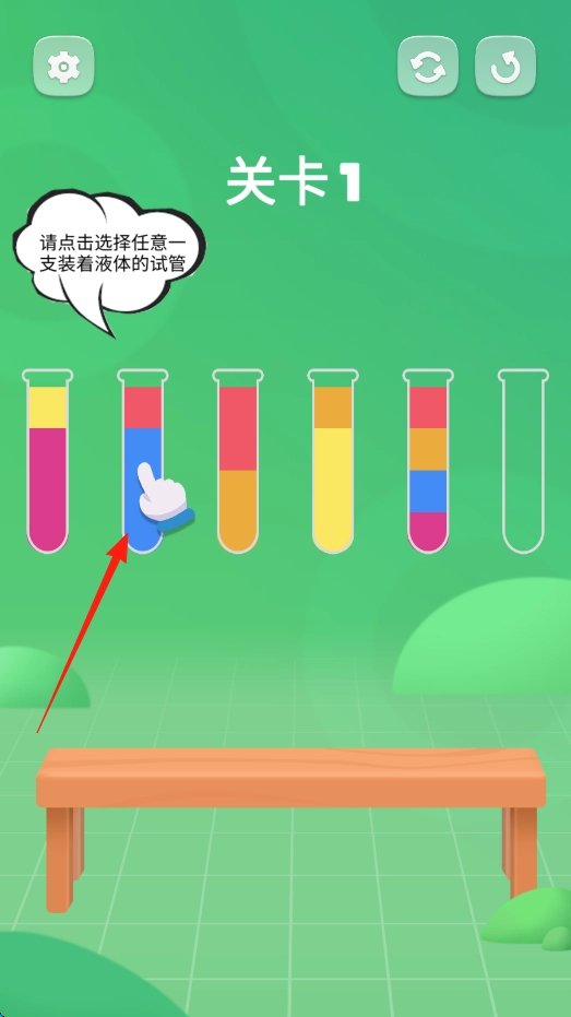 进入第一关后,找到盛有液体的试管并点击它,接着按照提示把液体倒入指定的空试管中。