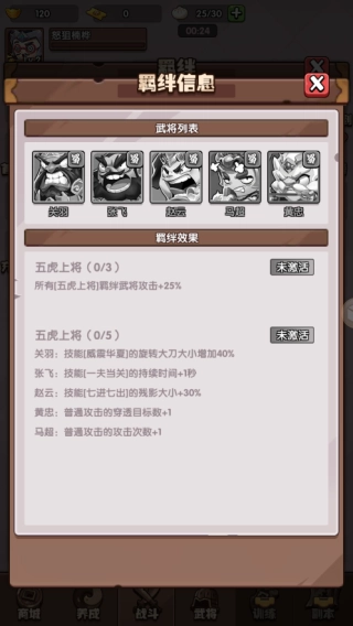 五虎上将——当关羽、张飞、赵云、马超、黄忠这五位武将同时在场时即可触发该组合效果,