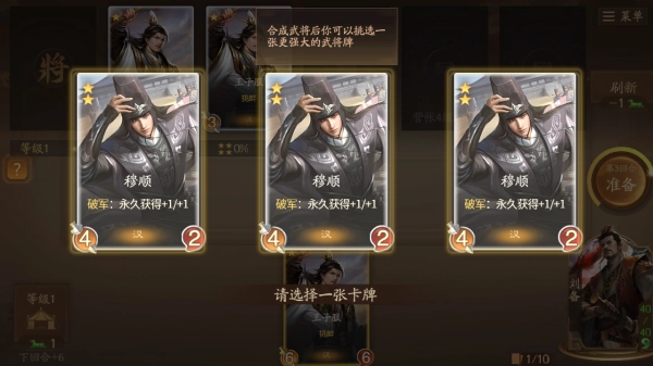 当玩家手牌与场上累计出现三张同名武将的非金色卡牌时,这三张武将牌将自动合成为该武将的金色版本,并且三张来源武将所带的全部强化效果都会被保留。金色武将不仅基础攻击力和体力值更高,技能效果也更为强力。此外,玩家还能从三张星级等于自身营帐等级加一的武将里挑选一张。