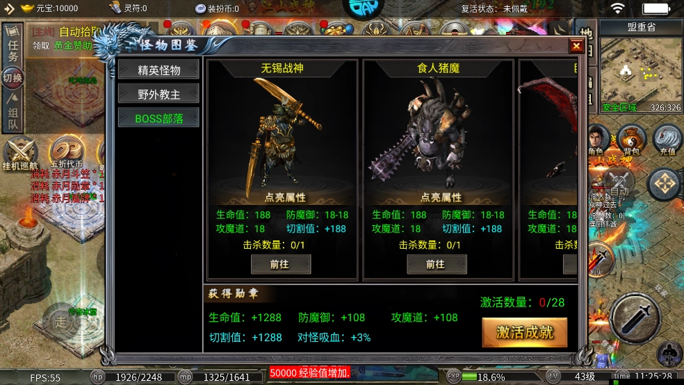 本服务器野外BOSS的爆率和BOSS部落的爆率一致,而且野外BOSS更容易击杀。未付费的玩家建议守好各个地图的野外BOSS,这样也能获取高阶装备,快速投身战场。