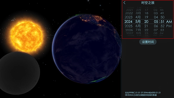 在时光穿梭装置中设定具体日期:校准精准的时间参数,就能观测到天体在过往岁月或未来时空里的准确状态。
