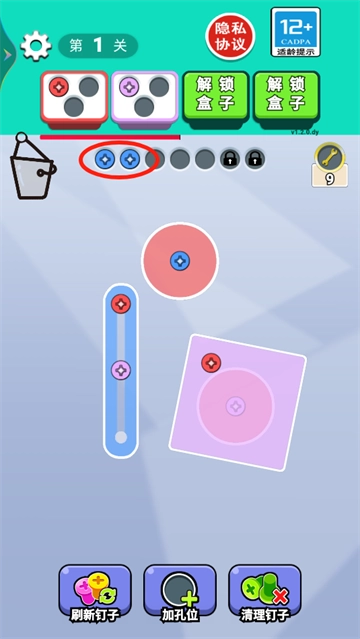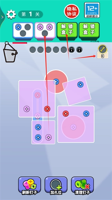 红色螺丝消除后,会立即刷新出新盒子,点击相同颜色的螺丝放置即可消除;若盒子空间不足,可点击解锁新盒子。