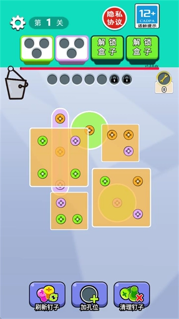 在游戏里,找到三个同色的螺丝,把它们放到对应颜色的盒子里,就能让这些螺丝消失。比如红色螺丝要放进红盒子,蓝色螺丝得放进蓝盒子。