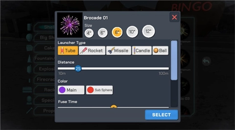 我们挑选其中一个点击后,就会弹出这样的界面,在这个界面里能选择烟花的尺寸、发射器的种类、烟花发射的远近、烟花引线燃烧的时长等参数。