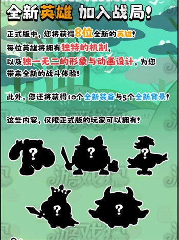 在正式版本里,你会解锁8位全新英雄,每个英雄都具备独特的技能机制,还有专属的外观形象与动画设计,能为你带来全新的战斗体验。