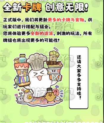 在正式版本里,我们会更新更多卡牌与食物,让玩家们能够尽情搭配和组合。届时你将体验到更多全新流派与刺激玩法,所有牌组也会涌现出更多富有创意的组合方式。