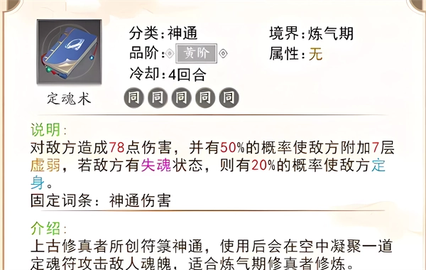 定魂术:攻击敌方并造成伤害,有一定概率使其陷入虚弱状态;若目标已处于失魂状态,则额外有概率触发定身效果。