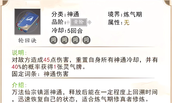 轮回诀的效果是直接重置所有神通的冷却时间,不过它有个使用条件——得一次性消耗4种灵气牌。因此,使用它的最佳时机,应该是当有神通正处于多回合冷却状态的时候。