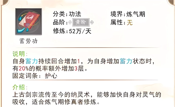 蓄势功:提升自身的蓄力回合数,倘若当前正处于蓄力状态,就有一定概率额外叠加层数。