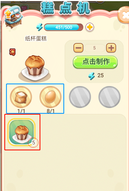 制作甜品时,红框标注的是我们现有的甜品种类和对应的数量,蓝框则显示制作一份该甜品所需的原材料。每次制作过程都会消耗一定的机器能量,需要注意的是,机器能量是每台机器单独计量的,不同机器之间的能量并不共享,所以拥有的机器数量越多,我们能够进行甜品制作的频率也就越高。
