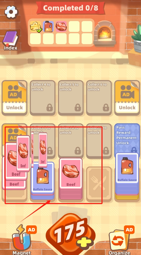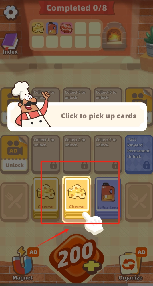 点击卡片来收集食材,当凑齐规定数量的食材后就能解锁新卡片,还可以借助磁铁来清理桌面上的杂物。