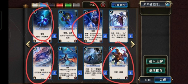 蓝色生物这边,低费实用的空军要带满,领风是空天猎的核心卡,有了它才能快速铺场;蓝色法术尽量多带过牌,但别太多,不然容易卡手,具体数量自己把握。红色的话,炎龙吐息得带满,其他解场牌看情况选,和法术配套的生物也建议带满。另外还有些不错的牌,比如331冲锋、驳回、复颂、214嘲讽、操控士之类的,只要你觉得合适都可以试试。空天猎本身就是套强度还可以的过渡卡组,没什么特别的讲究,更没有标准答案,手头有什么牌就带什么。