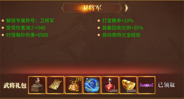 平民玩家进入游戏后,建议先领取首充福利,再激活卫将军特权。将青龙偃月刀提升到最高等级,回收后还能获得永久时装;再搭配卫将军特权,打宝速率直接提升3倍!