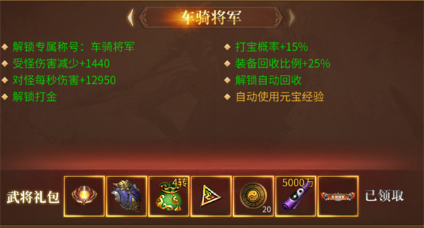 解锁骠骑将军特权,开启一键拾取功能,回收比例与极品爆率显著提高,轻松通宵挂机无压力,一觉醒来背包里神装满满!