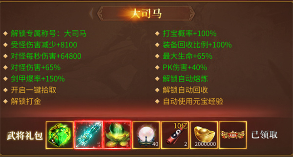 想要在游戏初期就抢占先机,让等级和属性领先他人,不妨激活大司马特权。这项特权附带高额的对怪增伤与受怪减伤属性,搭配武将礼包赠送的吸血武器,足以实现无伤越级刷怪。此外,购买后还会赠送经验轴和转生证明,能让你在等级提升和转生进度上瞬间拉开与其他玩家的差距!
