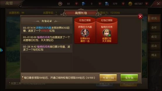 战盟红包是这样的:当战盟成员进行充值,或者有成员对世界BOSS造成最后一击时,系统就会向全体战盟成员发送红包,大家可以通过开启红包来领取绑钻。
