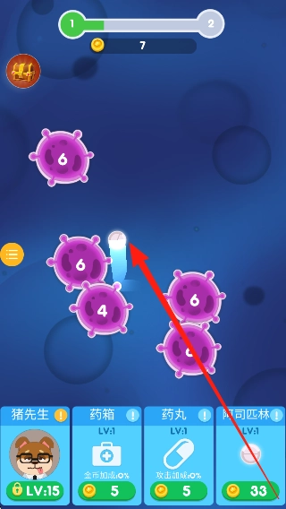 点击屏幕能够让药片加速,从而提升消除病菌的效率和速度,而且药片每和病菌发生一次碰撞,都会得到金币。