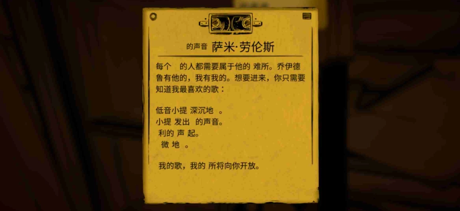 进入换衣间后,启动里面放置的另一台录音机,它会播放一段看似随机的内容。这段录音的声音来自Sammy Lawrence。结合剧情推测,Sammy Lawrence应该是班迪动画的音乐制作人,不过他的性格比较神经质。(更多相关内容可查看游戏秘密解析篇)