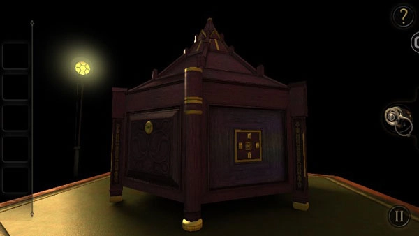 还记得八角桌上镶嵌的那三个图案吗?把那台造型奇特的投影仪(或者说探照灯)凑近一些,戴上目镜,就去寻找这三个图案吧!第一个位于左中位置,是个类似Z字母翻转过来的图案。