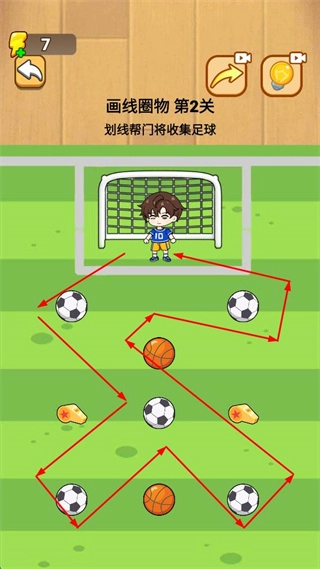 在画线圈物的任务里,用划线把所有足球都连接起来,同时避开篮球之类的物品,以此帮助门将完成收集工作。