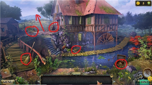 在水车前方的水面上,先用扫帚清理掉漂浮的树枝和杂物,这样就能找到那把木勺了。