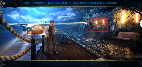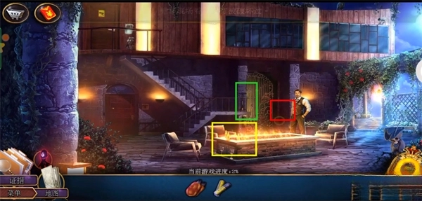 进入房间后先进行对话。接着前往右上角的后院区域。到后院后,先点击中央的侦探,拿到红框标注的相机。之后点击黄色区域放大画面,获取剪枝钳;再点击绿色区域放大,拿到门边的抽气泵。最后点击灰色区域,用刚得到的相机拍照留存关键证据,这样就完成引导教程了。