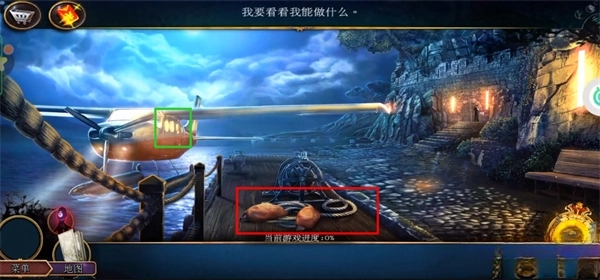 首先获取画面中标注红框区域内的浮标与绳索,随后把绳索用于绿框里的飞机部位,点击机舱门完成放大操作后进入内部,获取公文包。