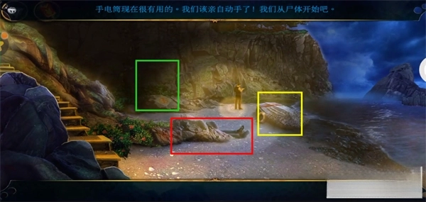 回到悬崖边,用手电筒照亮阴影地带。先把红框区域放大,给尸体拍照留存证据。随后揭开尸体头部的布料,再次拍摄面部作为证据。接着点击尸体手上的手表获取关键信息,翻开衣服找到钱包,里面有密码图案。继续放大小船,移开救生圈后,在左侧绳索位置安装充气浮标,并用抽气泵打气,多次点击小船后拿到马克的钱包,阅读里面的纸条获取线索。再从钱包左下方拿出卡片。最后放大绿色区域,用剪枝钳取出第二个金字塔碎片。