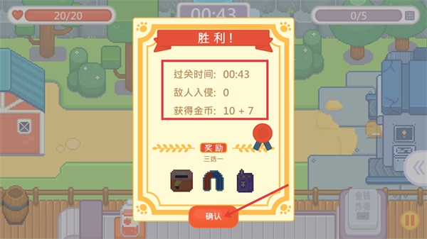 胜利之后会显示【过关时间-00:43】这类数据,还能得到【金币-10+7】,点击【确认】按钮后,就可以从三个选项里挑选一个奖励。