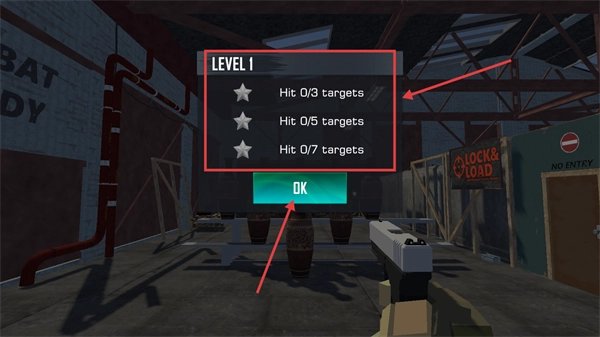 进入关卡查看【LEVEL1】的目标,点击【OK】按钮确认后,即可开始执行射击任务,通过完成任务来提升技能。