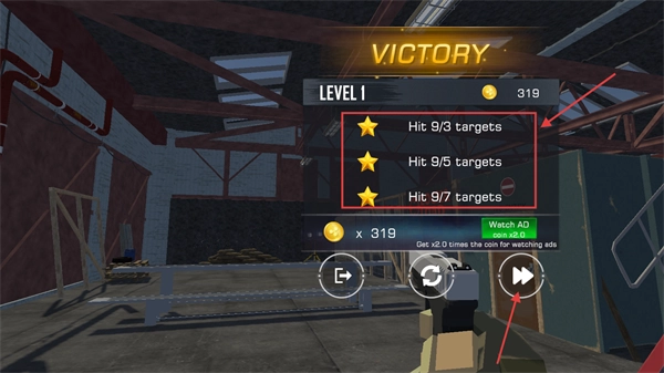 完成目标获得三星评价,即可领取319枚金币,解锁更强大的武器,继续挑战全新关卡。