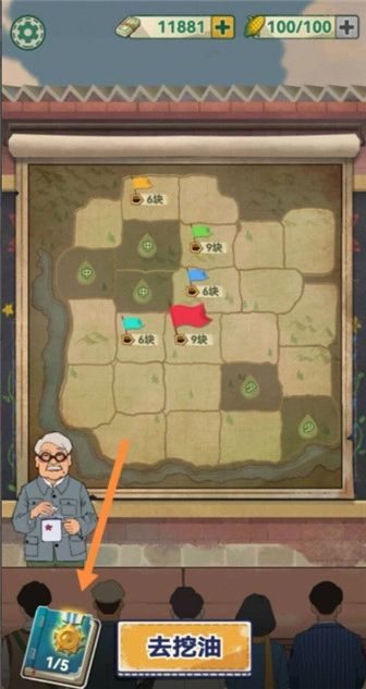 如图所示,把勘探员拖到指定的地方。要是勘探员手里拿着红旗,就说明他所在位置的地下有油田。