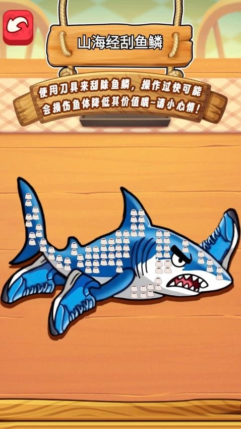3、把钓到的鱼拿到小船中间的刮鳞站,借助工具给鱼刮鳞,要尽量把鱼身上的鱼鳞都清理干净,避免刮伤鱼身。操作完成后点击右侧的按钮,就能结束这一步骤并获得奖励了。
