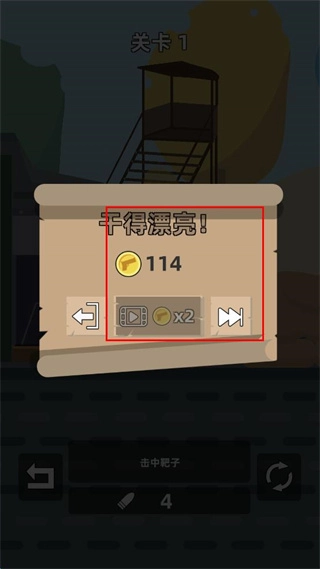 4、击中靶子后会弹出提示框,显示“干得漂亮”以及114金币,此时可以选择返回观看视频来翻倍奖励,或者直接进入下一关。