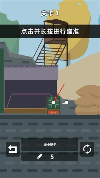 3、进入关卡1后,按照提示点击并长按屏幕完成瞄准操作,将准星对准55米外的靶子,随后点击发射按钮让子弹击中靶子。